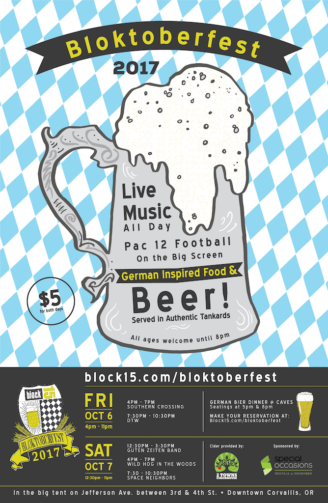 (Corvallis, OR) — In celebration of the changing season and in the tradition of the German Oktoberfest, Block 15 Brewing Company is hosting its 9th annual “Bloktoberfest” on October 6 and 7. The event transforms Jefferson Avenue in front of Block 15’s downtown pub with a giant tent that houses live music, yard games, and big-screen college football action featuring the Beaver game and other Pac-12 matchups—all accompanied by Block 15 beer served in authentic tankards (including its seasonal Bloktoberfest release) and German-inspired food from the Block 15 kitchen.