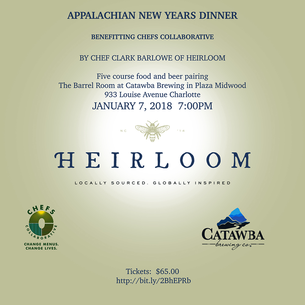 (Charlotte, NC) – Catawba Brewing Company continues its immensely popular Culinary Series with an Appalachian New Year’s Dinner by famed Chef Clark Barlowe of Heirloom. A generous portion of the proceeds will benefit Chefs Collaborative. For the event, Chef has teamed with Catawba Brewing for a very unique white walnut shell small batch beer! The first dinner course will be served in an interactive cocktail party setting with a casual tour of the brew house. Following the tour, guests will be seated family style for three entrées, each paired with a different craft beer. The final course will be dessert paired with a bourbon barrel-aged beer. Chef’s offerings will be based on a traditional New Year’s dinner, promising good fortune and health for the year ahead.